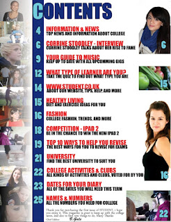 It is difficult to evaluate Bodmin Colleges magazine content page alongside the front cover because it doesn't have a contents page, so i selected an appropriate college related one from the internet. The bright bold text and images immediately attract your attention, which will make the audience interested in what the magazine has to offer. This contents page is appropriate to its primary target audience because it is relatable to them - it shows them students of a similar age who may or may not be interested in the same sort of things. This would be influenced in certain articles. This also shows that the primary target audience is students (aged 16-18) who also attend this college. The layout follows a neat, organised structure, and the articles appeal to their audience because it is relevant to them. It also uses direct address to make the audience feel more involved. For example, 'dates for your diary' and '10 ways to help you revise' will make the audience feel like the magazine is targeting their needs and interests.